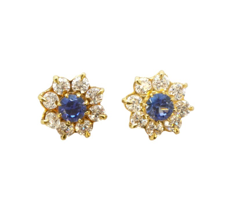 Náušnice ze zlata ryzosti 585/1000 zdobené zirkony a syntetickými safíry. Rozměr náušnice 1,0 x 1,0 cm. Celková hmotnost náušnic 2,76 g.