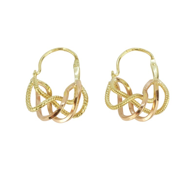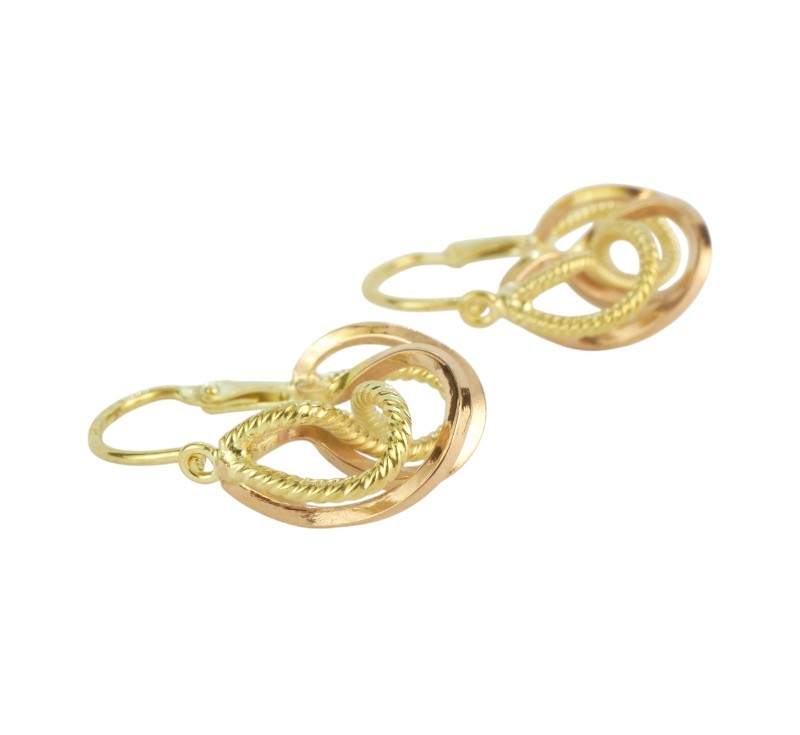 Náušnice jsou zhotovené v kombinaci žlutého a růžového zlata ve tvaru uzlů a mají ryzost 585/1000 a jejich celková hmotnost je 3 g. Délka náušnice je 2 cm.