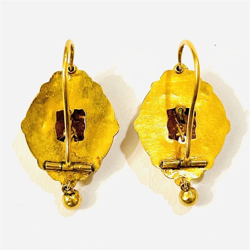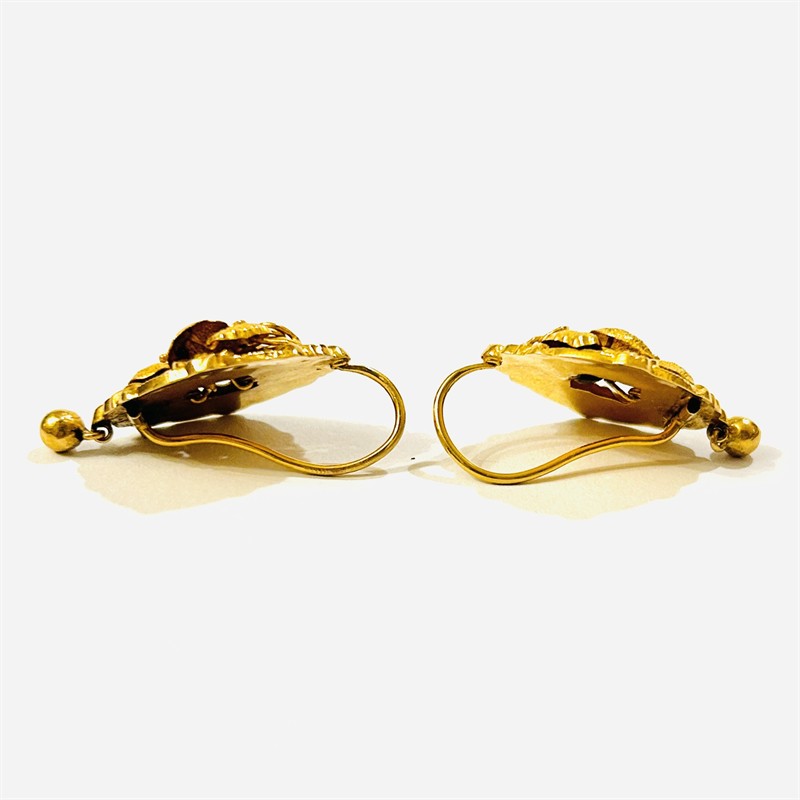 Honosné, větší náušnice z období pozdního biedermeieru, hlavice ve tvaru plastické kartuše s jemně rytou aplikací květu s listy, doplněno decentními kuličkovými ověsky. Západoevropská klenotnická práce ze 3. čtvrtiny 19. století. Vyrobeno technikou foukaného kovu. Zhotoveno ze sytě žlutého 19,2 karátového zlata, tj. o ryzosti 800/1000; vyhotoveno osvědčení puncovního úřadu, neznačeno. Hmotnost 6,05 g, celková délka 35 mm, šířka 20,5 mm. Zapínání formou dětské brizury v pořádku, nečištěno, celkově ve velmi zachovalém stavu.