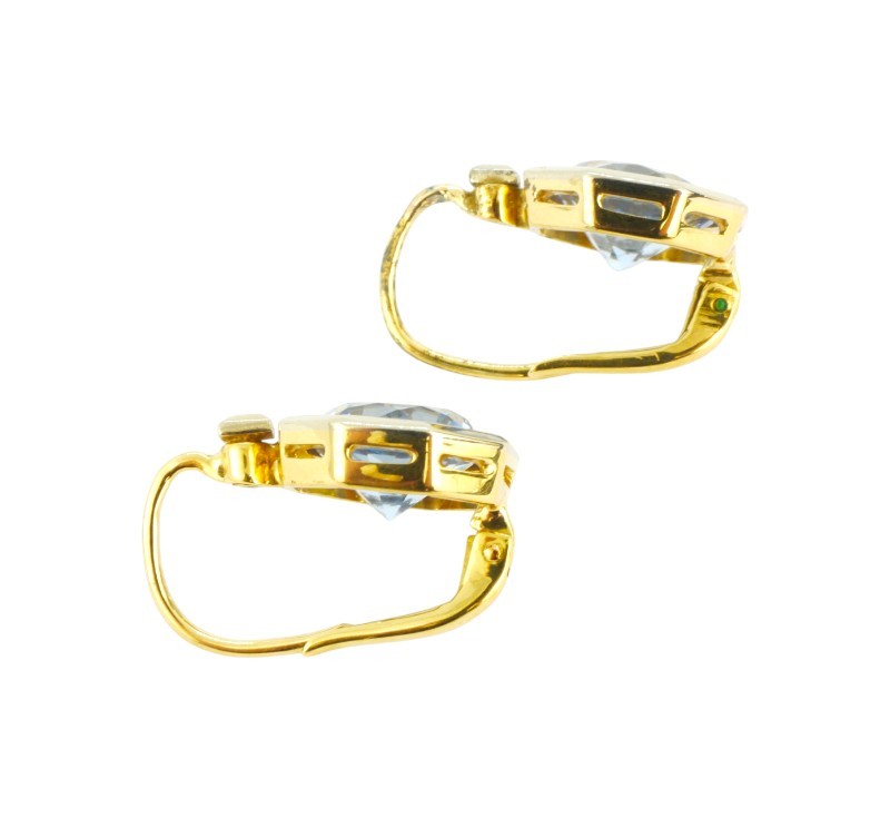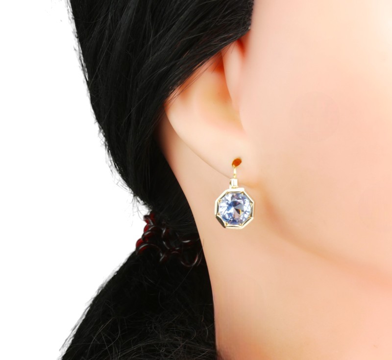 Půvabné náušnice vyrobené ze zlata ryzosti 585/1000 (punc lvíček) zdobené blankytně modrými spinely, průměr spinelu 1 cm. Rozměry náušnic 1,5 x 1,2 cm. Celková hmotnost 4,53 g.