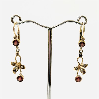 Velice půvabné visací náušnice z období secese, hlavice ve tvaru tradičních "sněhuláků", ověsek ve tvaru stylizovaného listu, osazeno nezvykle pestrou kombinací přírodních almandinů a leukosafírů kulatého brusu, českých granátů a přírodních bílo-šedých perel. Pražská klenotnická práce z počátku 20. století. Zhotoveno z narůžovělého žlutého 14 karátového zlata, tj. o ryzosti 580/1000; rakousko-uherský punc Z-27 (liška 4) s písmenem „C“ (značí pražský puncovní úřad) a mistrovská značka na dřících a ověsku. Hmotnost 2,51 g, celková délka 37,5 mm, šířka 9 mm. Klapkové zapínání v pořádku, jeden dřík v minulosti opravován, jinak v zachovalém stavu, odborně vyčištěno a vyleštěno zlatníkem.