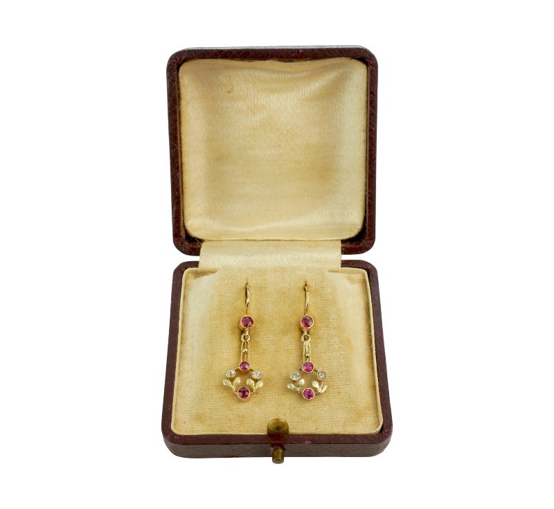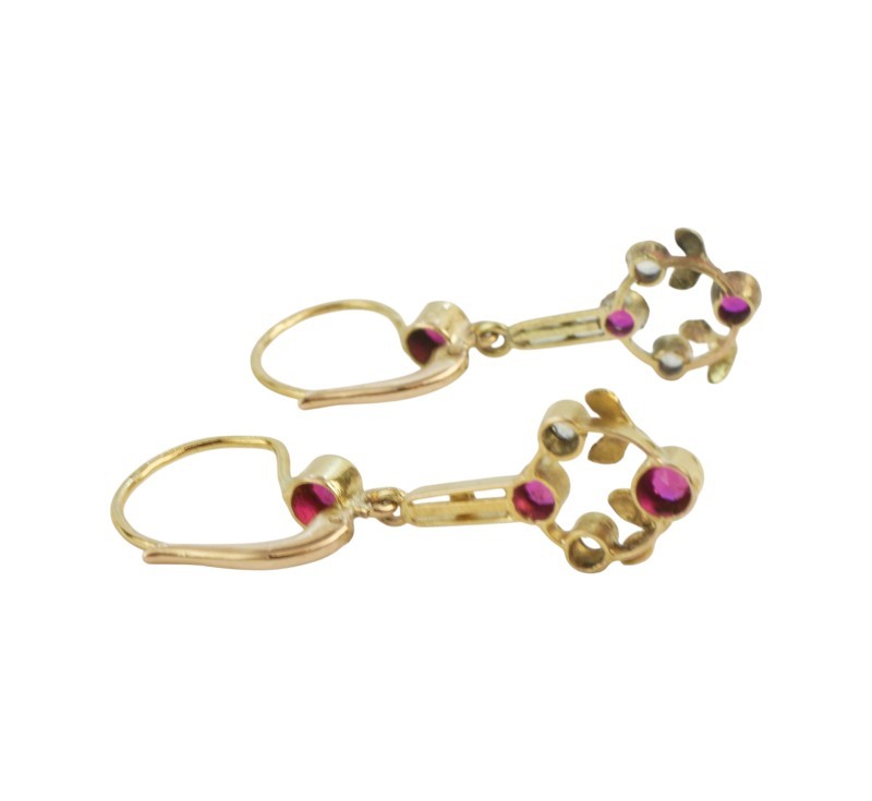 Zlaté secesní náušnice s rubíny a leukosafíry