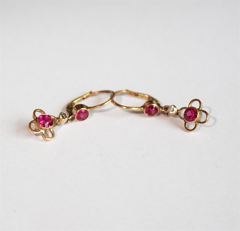 Půvabné visací náušnice z období secese s ověsky ve tvaru prořezávaného kvadrilobu, osazeno syntetickými rubíny a drobnějšími leukosafíry kulatého brusu, fasováno v plně přiléhajících obrubách. Minimalističtější nadčasový design, práce významného pražského klenotníka Pavla Vávry z přelomu 10. a 20. let 20. století. Zhotoveno z narůžovělého žlutého 14 karátového zlata, tj. o ryzosti 580/1000; prvorepublikový punc Z-36 (čejka 4), písmeno „C“ (značí pražský puncovní úřad) a mistrovská značka "PV" na dřících. Hmotnost 2,19 g, celková délka 28 mm, šířka 8,5 mm. Klapkové zapínání v pořádku (pouze jedna klapka volnější, funkční a při zapnutí dobře drží), celkově ve velmi zachovalém stavu.