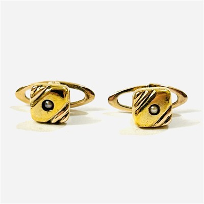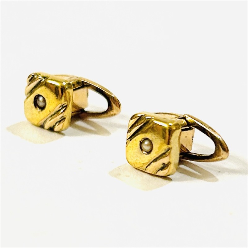 Decentní knoflíčky do náprsenky s čtvercovou hlavicí osazenou ve středu přírodní bílo-šedou perlou, při rozích přepásané plastickými liniemi. Lze nosit i jako drobné manžetové knoflíčky do francouzské manžety. Kvalitní západoevropská zlatnická práce z poslední čtvrtiny 19. století. Zhotoveno z narůžovělého žlutého 14 karátového zlata, tj. o ryzosti 585/1000; rakousko-uherský dovozový punc Z-25 (AV) s písmenem "A" (značící vídeňský puncovní úřad) zespoda. Hmotnost 2,29 g, délka i šířka hlavice 6,5 mm. Zapínání v pořádku, celkově ve velmi zachovalém stavu, odborně vyčištěno a vyleštěno zlatníkem.