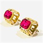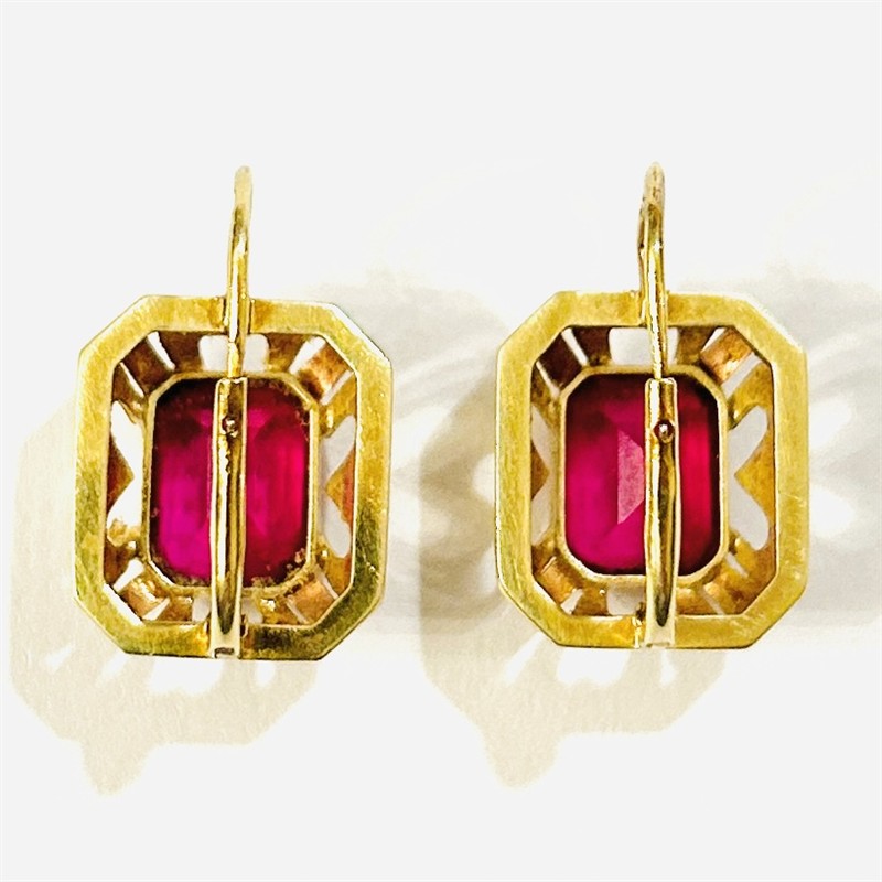 Výraznější, honosně působící náušnice v novobarokním pojetí. Hlavice osazeny syntetickými rubíny obdélného brusu v zrnitých obrubách, zkosený rámeček s prořezávanými stylizovanými ornamenty ve dvou barvách zlata, jemně ryto. Solidní práce československého družstva Znak či Zlatokov z 60. až 80. let 20. století. Zhotoveno ze žlutého a červeného 14 karátového zlata, tj. o ryzosti 585/1000; československý punc Z-36 (čejka 4), ryzostní číslo a značka výrobce "Z-2" na dřících. Hmotnost 5,18 g, celková délka 19,5 mm, šířka 13 mm. Klapkové zapínání s pojistným zobáčkem v pořádku, ponechány s velmi lehkou přirozenou patinou, lze vyčistit, celkově ve velmi zachovalém stavu.