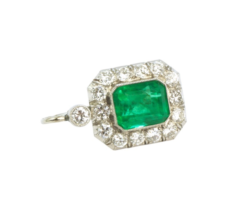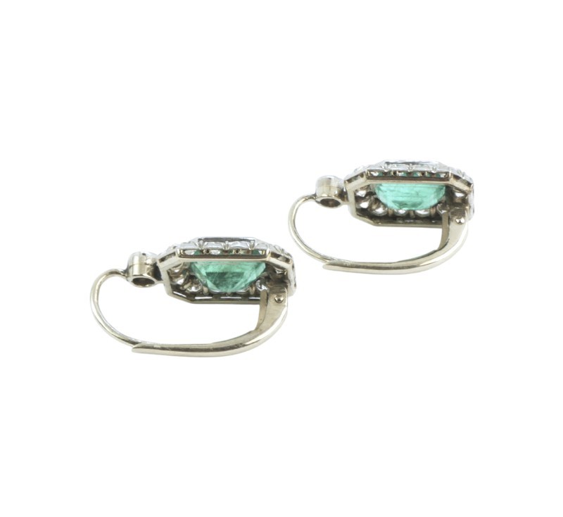 Starožitné náušnice z bílého zlata ryzosti 585/1000 jsou osazeny smaragdy bagetového brusu a diamanty o celkové hmotnosti cca 2,80 ct. Rozměry náušnice jsou 2,1 x 1,3 cm. Celková hmotnost obou náušnic je 5,44 g. Krásná zlatnické práce ,odborně vyčištěno zlatníkem