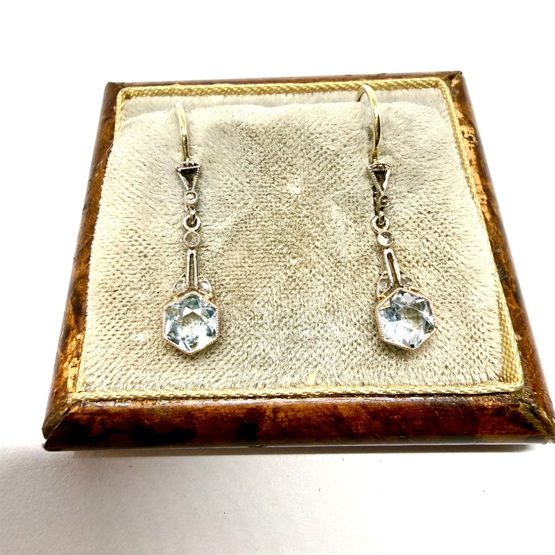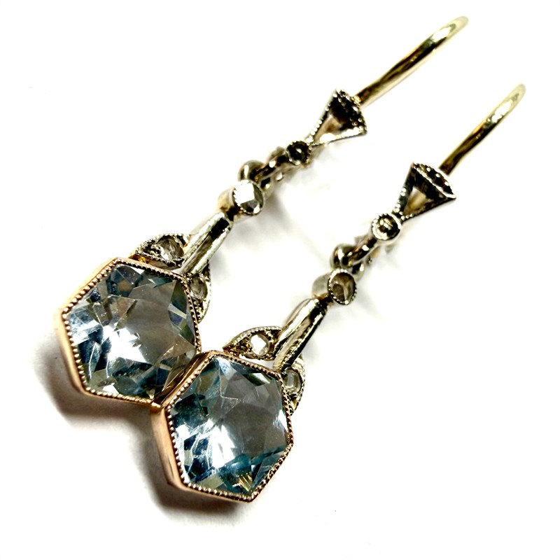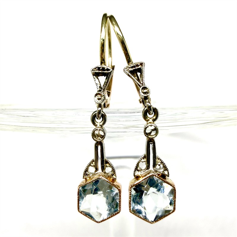 Jemné, prvorepublikově decentní, závěsné náušnice. Šperku dominuje kinetický ověs osazený akvamarínem fazetového brusu. Náušnice byly zhotoveny v období první republiky v kombinaci zlata bílého a žlutého odstínu. Kombinace ryzosti 585/1000, 490/1000 a 333/1000. K šperku je zhotoveno osvědční puncovního úřadu. Celková váha 1,42 g. Délka 2,8 cm. Profesionálně vyčištěno zlatníkem. Půvabný šperk vhodný k dennímu užití i slavnostní příležitosti je v perfektním stavu. Krabička není součástí prodeje.