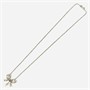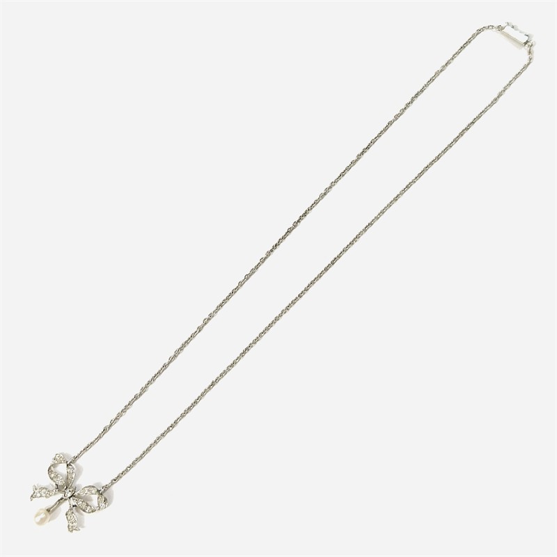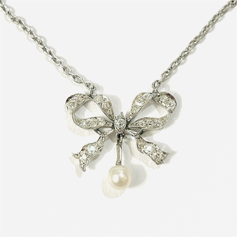 Půvabný, jemný náhrdelník z období secese, ozdobná část ve tvaru stylizované mašle osázená přírodními diamanty kulatého jednoduchého brusu (achtkant) o celkové váze 0,49 ct (23 ks), jejichž kvalita je dobrá, v ověsku osazeno bílou perlou o průměru 4,5 mm, u níž není vyloučen přírodní-divoký původ. Západoevropská klenotnická práce z počátku 20. století. Spodní část závěsu zhotoveno z bílého 15,1 karátového zlata, tj. o ryzosti 630/1000, zapínání ze 14 karátového, tj. o ryzosti 585/1000, uložení kamenů a řetízek z platiny o ryzosti 950/1000; vyhotoveno osvědčení puncovního úřadu, ryzostní číslo na zapínání. Hmotnost 6,25 g, celková délka 41 cm, ozdoba 22 mm, šířka vazby 1,5 mm, ozdoba 19 mm. Jazýčkové zapínání včetně "8" pojistky v pořádku, celkově ve velmi zachovalém stavu, odborně vyčištěno a vyleštěno zlatníkem. Součástí odborný posudek.