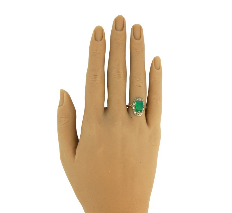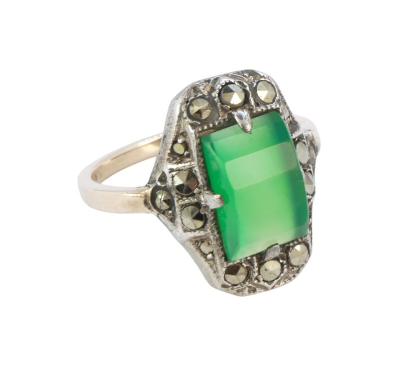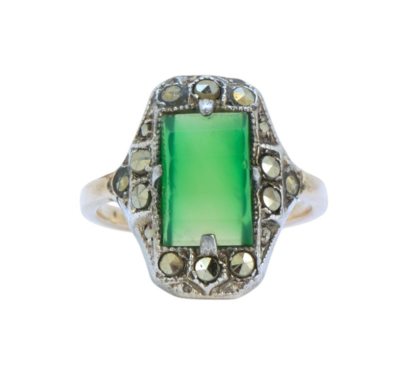 Prsten vyrobený z kombinace zlata (ryzost 250/1000) a stříbra (ryzost 925/1000) zdobený markazity a chryzoprasem. Rozměry hlavy prstenu 1,7 x 1,5 cm. Velikost 51. Hmotnost 3,03 g. K dispozici Osvědčení z puncovního úřadu.