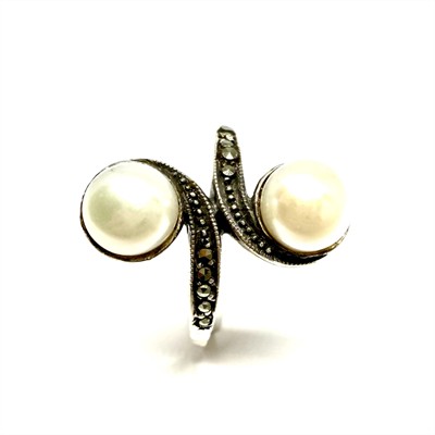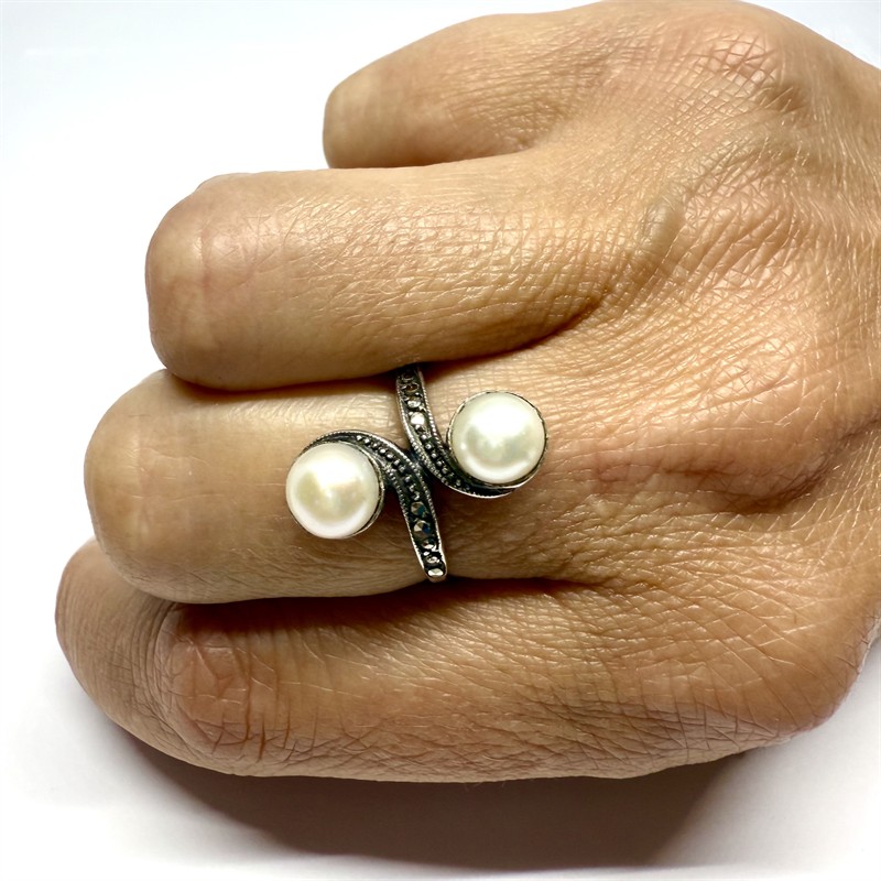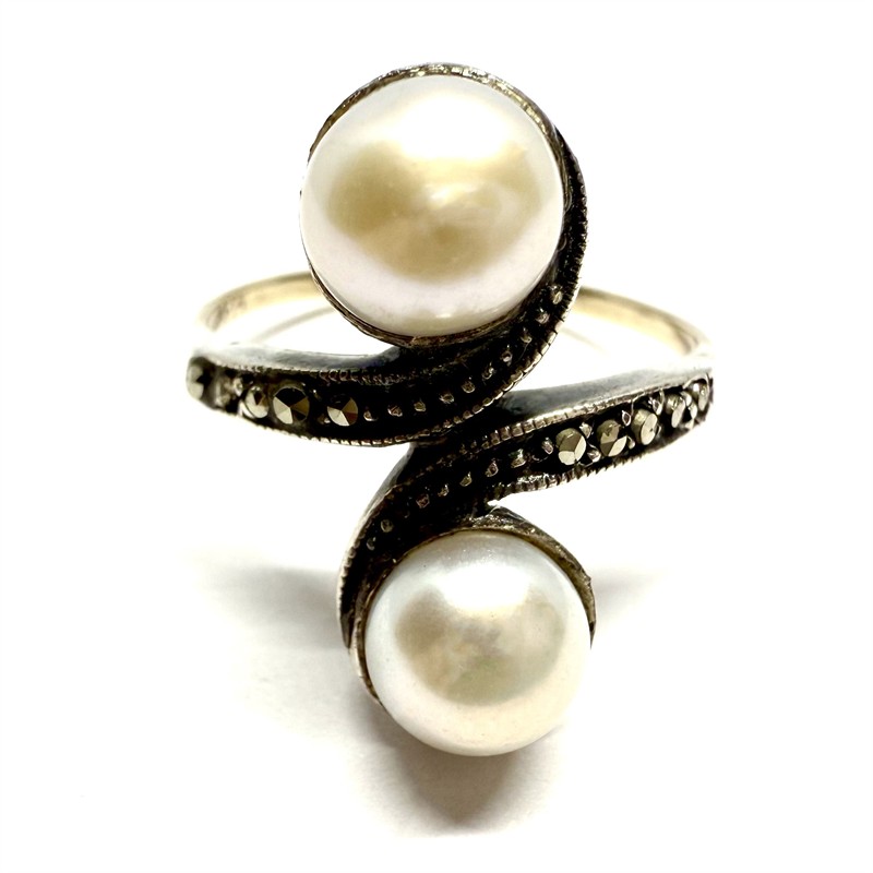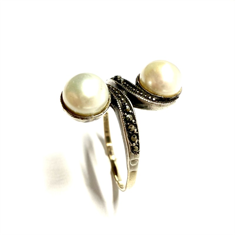 Velmi půvabný prsten zhotovený v kombinaci zlata a stříbra. Šína šperku byla zhotovena ze zlata ryzosti 333/1000 a hlava ze sterlingového stříbra (925/1000). Zdobeno sněhobílými perlami a drobnými, elegantními markazity. Celková váha 3,10 g. Velikost 54. Šperk byl profesionálně vyčištěn zlatníkem a je v perfektním stavu.