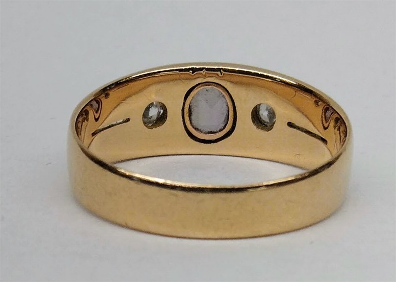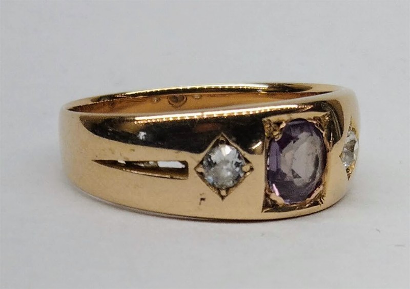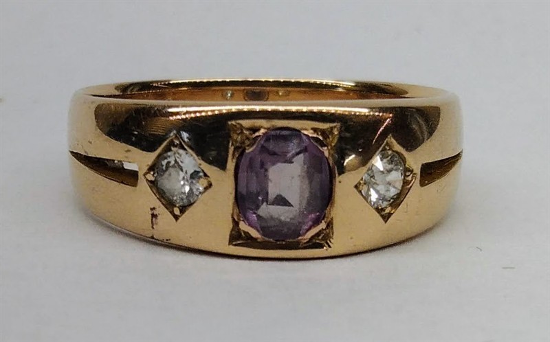 Zlatý alianční prsten se ametystem oválného brusu a dvěma diamanty starého briliantového brusu, celkem 0,30 ct. Celková hmotnost Au 4,25 g/585/1000, osvědčení Puncovního úřadu. Německo, začátek 20. století, šířka 0,7 cm, velikost prstenu 59.