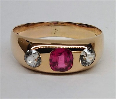 Zlatý alianční vídeňský prsten s rubínem a leukosafíry