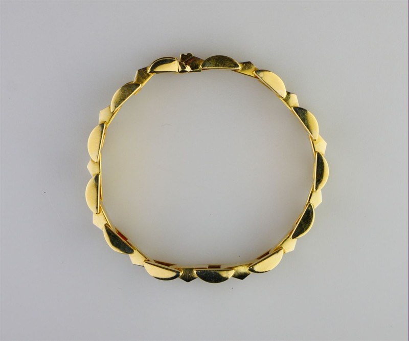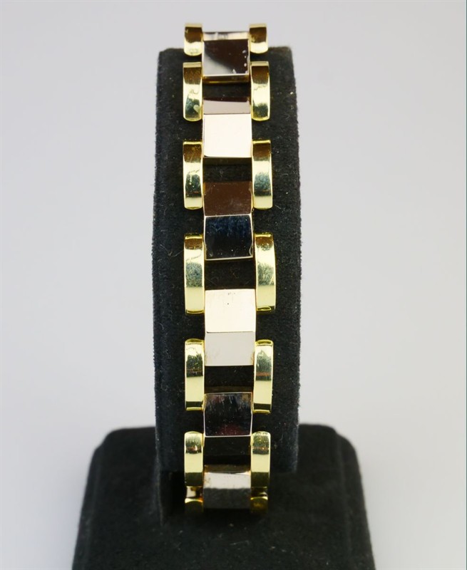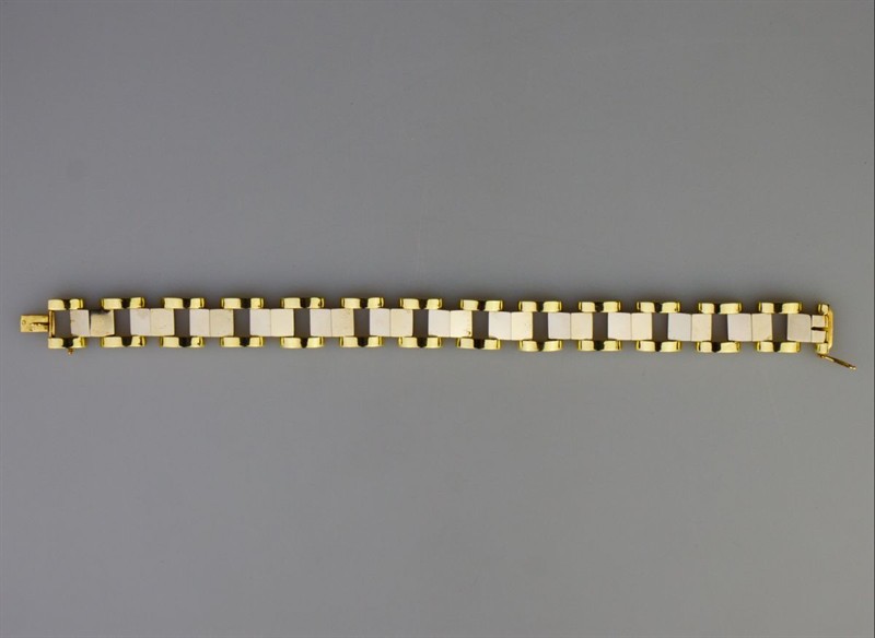 art deco náramek z bílého a žlutého zlata v kombinaci oblých a trojúhelníkových článků, Au 16,60 g/585/1000, Československo, kolem r. 1930, dobová puncovní značka (lvíček); délka 18,5 cm