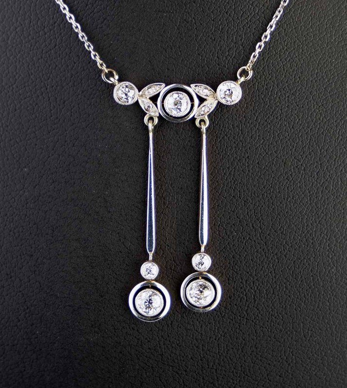 zlatý art-deco kolier s diamanty, kvalitní diamanty briliantového brusu o hmotnosti 0,82 ct, čistota VS1-VS2, barva H-I. Celková hmotnost Au 4,50 g/585/1000, osvědčení Puncovního úřadu. Evropa, 20. léta 20. století, délka 34 mm