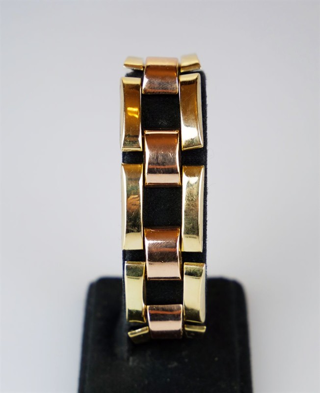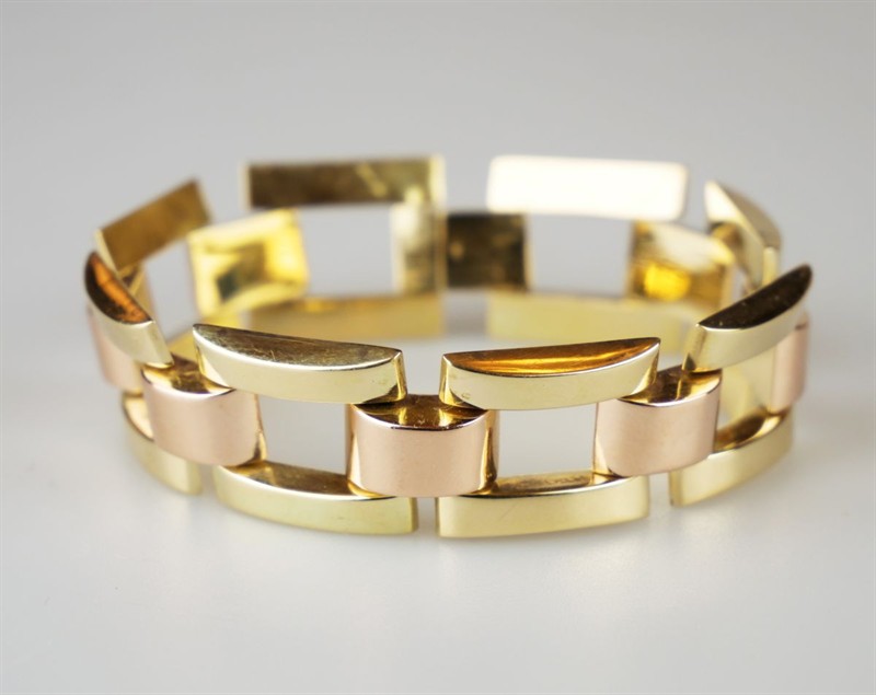 Zlatý elegantní art-deco článkový náramek z růžového a žlutého zlata. Celková hmotnost Au 32,01 g/585/1000, dobový maďarský punc a pozdější český punc. Maďarské království, 30. léta 20. století, perfektní stav, délka 18,5 cm, šířka 1,8 cm.
