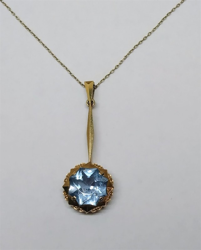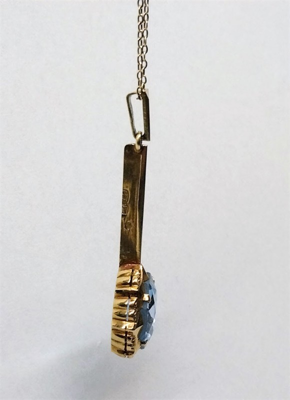 Zlatý art-deco přívěsek s blankytně modrým syntetickým kamenem a s řetízkem. Celková hmotnost 4,21 g, Au 585/1000, punc lev (Z - 45), ryzostní číslo, značka výrobce v kartuši PA. Velmi dobrý stav, Republika Československá, první třetina 20. století. Průměr přívěsku 1,4 cm, délka s očkem 3,9 cm, délka řetízku 48 cm.