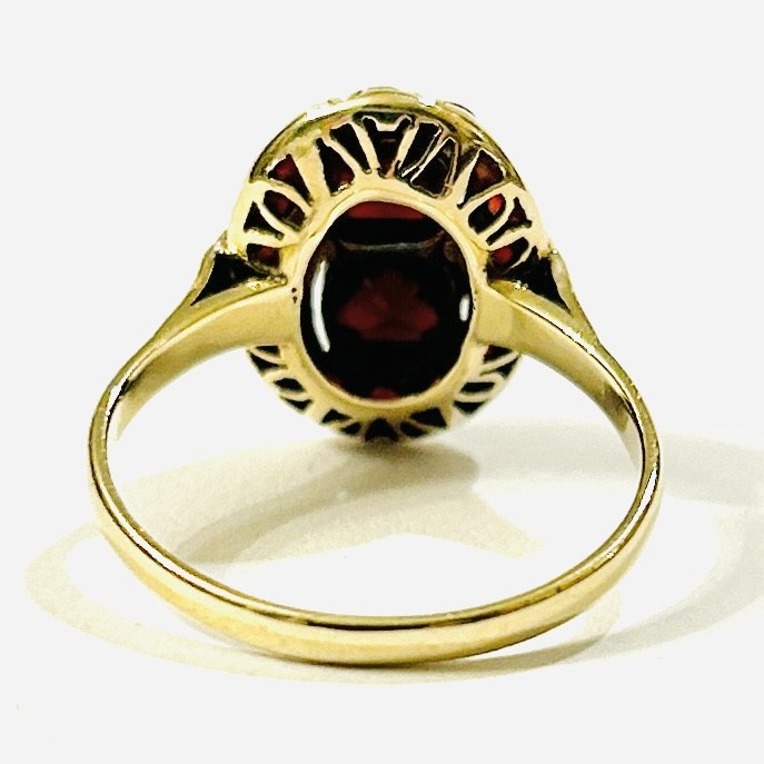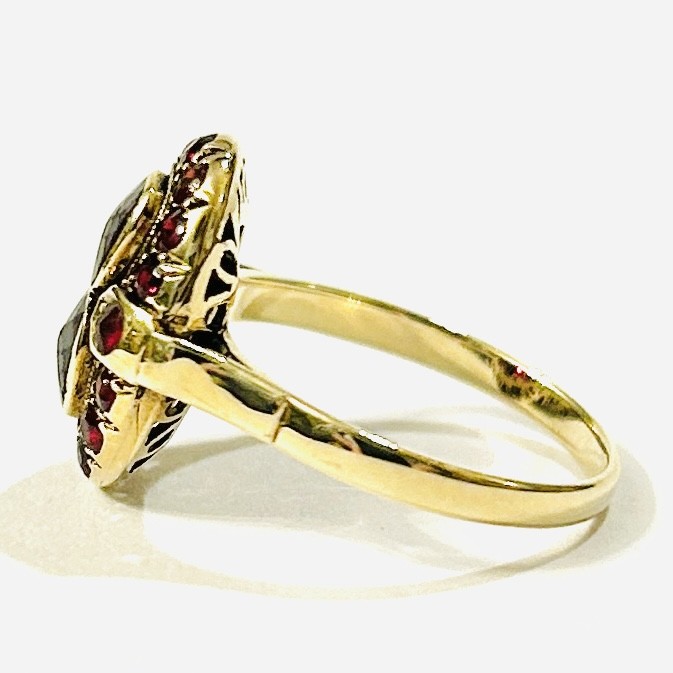 Elegantní prsten z období art-deco, geometricky stavěná oválná hlavice osazena českými granáty, 2 centrální obdélného šachovnicového brusu (o nadstandardním rozměru téměř 5 mm), drobné kulatého brusu. Fasováno obrubou, opatřeno průsvitkami. Precizní tuzemská klenotnická práce z 30. let 20. století. Zhotoveno ze žlutého 14 karátového zlata, tj. o ryzosti 585/1000; nově opatřeno puncem Z-58 (labuť 4) a nečitelné původní značení zevnitř šíny. Hmotnost 2,64 g, velikost 54, délka hlavice 15 mm. Stopy nošení, celkově v dobrém stavu, odborně vyčištěno a vyleštěno zlatníkem.