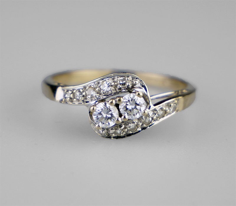 Zlatý art-deco prsten s diamanty, 14 diamantů o hmotnosti 0,52 ct, barva H-I, kvalita VS-SI. Celková hmotnost Au 2,50 g/585/1000, osvědčení Puncovního úřadu. Západní Evropa, první třetina 20. století, velikost prstenu 56