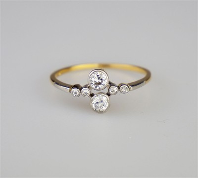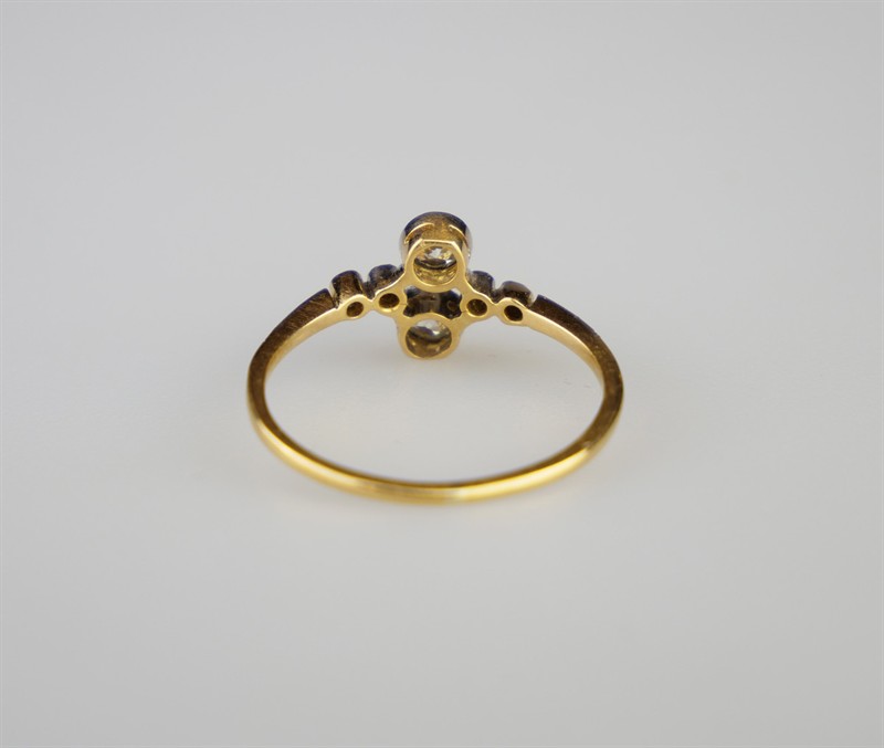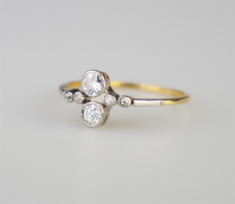 Zlatý art-deco prsten s diamanty, hmotnost 6 diamantů briliantového brusu 0,47 ct, barva H-I, kvalita SI. Celková hmotnost Au 2,05 g/585/1000, osvědčení Puncovního úřadu. Západní Evropa, první třetina 20. století, velikost prstenu 57,5