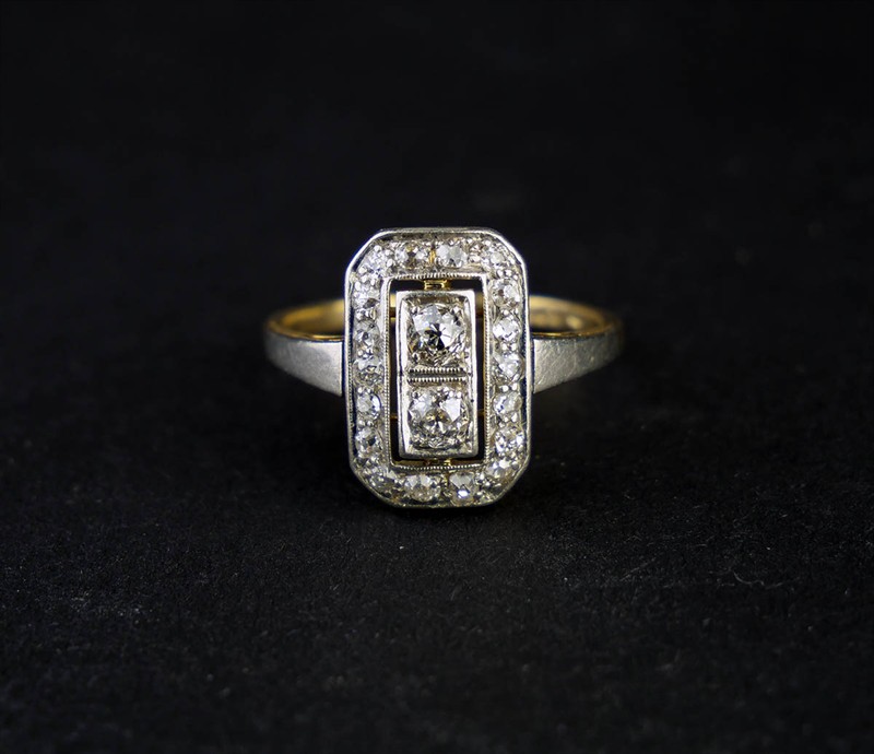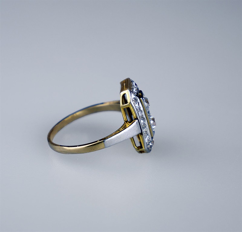 Zlatý dvojbarevný art-deco prsten s diamanty briliantového brusu, celkem 0,95 ct, barva H-I, kvalita VS1-SI1. Celková hmotnost Au 3,45 g/585/1000, punc. Západní Evropa, první třetina 20. století, velikost prstenu 54