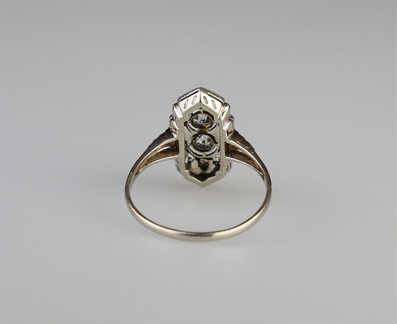 Zlatý art-deco prsten s 8 diamanty briliantového a routového brusu, celkem 0,30 ct, barva I-J, kvalita VS-SI. Celková hmotnost Au 2,25 g/585/1000, punc. Republika Československá, první třetina 20. století, velikost prstenu 58.