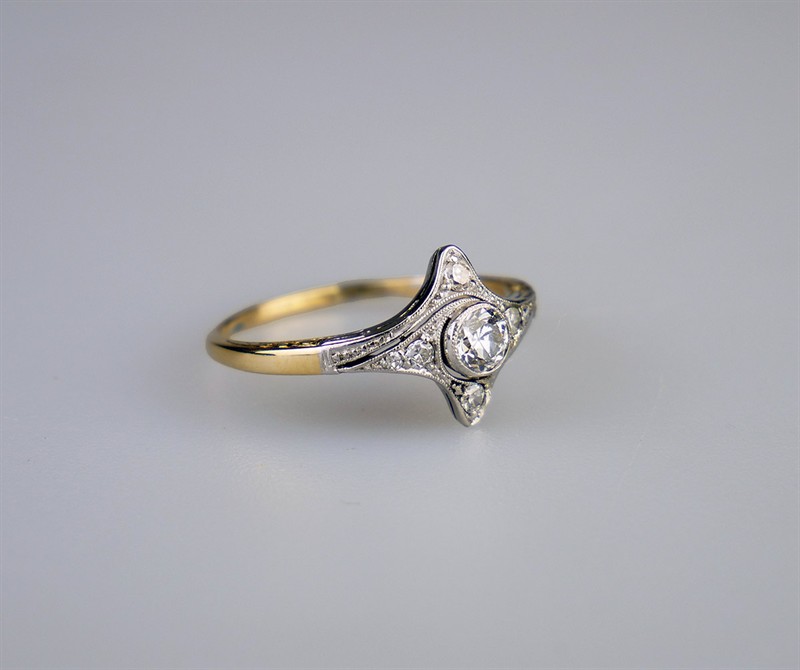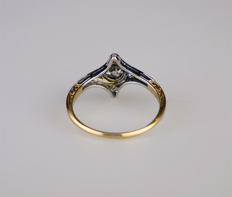 Zlatý art-deco dvoubarevný prsten briliantového a routového brusu, celkem 0,37 ct, barva H-I, kvalita SI. Celková hmotnost Au 1,80 g/585/1000, punc. Republika Československá, první třetina 20. století, velikost prstenu 54.