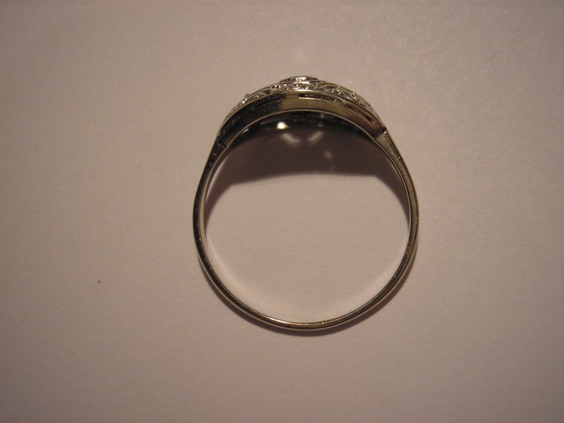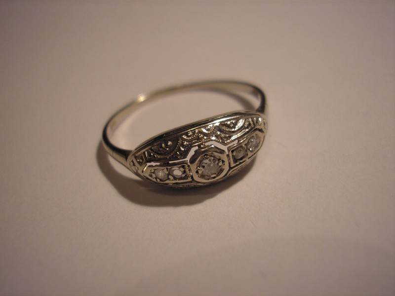 Elegantní prsten z období art-deco, prořezávaná hlavice osazena 5 přírodními diamanty starého brusu. Zhotoveno z bílého 14 karátového zlata, ryzosti 585, celková váha je 1,2g ,velikost 56.