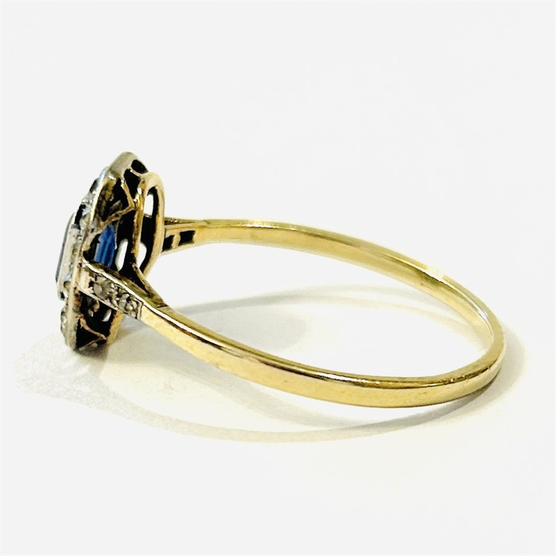 Elegantní prsten z období art-deco, obdélná hlavice se skosenými rohy osazena centrálním syntetickým modrým safírem obdélného brusu, rámováno a na ramenech šíny přírodní diamanty kulatého jednoduchého brusu (achtkant) o celkové váze cca 0,45 ct (0,025 ct - 18 ks), které jsou velmi dobré až dobré kvality, fasováno obrubou a v lůžkách, zdobně prořezávaná hlavice. Západoevropská klenotnická práce z 20. až 30. let 20. století. Zhotoveno ze žlutého zlata, bízo z 18 karátového, tj. o ryzosti 750/1000, šína ze 14 karátového, tj. o ryzosti 585/1000, kameny uloženy v platině; vyhotoveno osvědčení puncovního úřadu, neznačeno. Hmotnost 3,45 g, velikost 71 (!) (pro silné prsty či na rukavici), délka hlavice 12 mm, šířka 10 mm. Modrý safír poškozený (viditelné pod lupou), jeden diamant v minulosti vyměněný za kulatý briliantový brus, lehké stopy nošení, ponecháno s jemnou přirozenou patinou, lze vyčistit, celkově v zachovalém stavu.