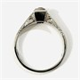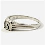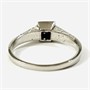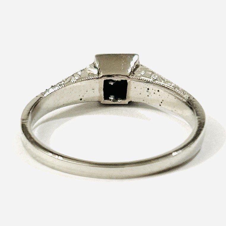 Velice elegantní prsten zásnubního typu ve stylu art-deco, osazený ve vyšší čtvercové hlavici syntetickým leukosafírem kulatého brusu, ramena šíny z frontálního pohledu s rytými dynamickými liniemi, boky s dekorativním gravírováním. Kvalitní práce pražského klenotníka Cyrila Klenera z přelomu 30. a 40. let 20. století. Zhotoveno z bílého 14 karátového zlata, tj. o ryzosti 585/1000; prvorepublikový punc Z-45 (český lev 4), ryzostní číslo a mistrovská značka „CK“ zevnitř šíny. Hmotnost 3,07 g, velikost 57, šířka hlavice 5,5 mm. V zachovalém stavu, odborně vyčištěno a vyleštěno zlatníkem.