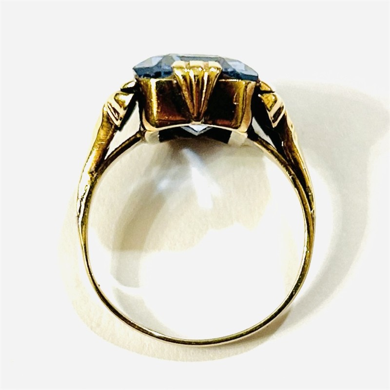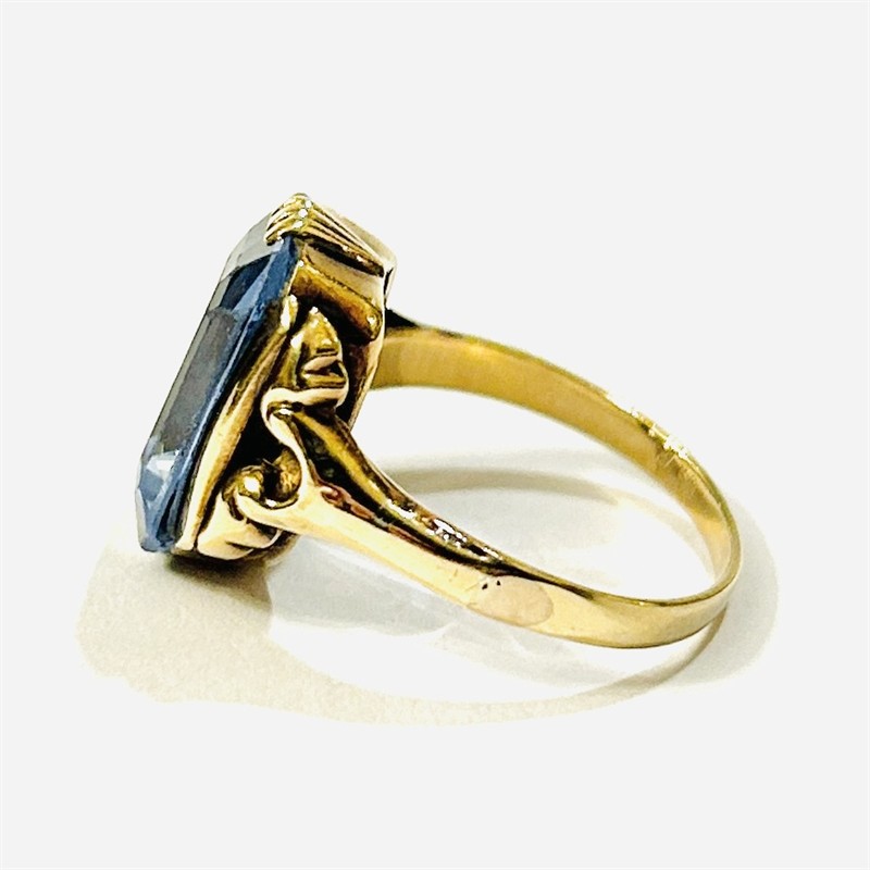 Elegantní prsten z období art-deco osazený modrým kamenem obdélného brusu, vějířovitě pojaté podlouhlé krapny, ramena šíny ve tvaru křidélek. Tuzemská zlatnická práce z 30. let 20. století. Zhotoveno ze žlutého 14 karátového zlata, tj. o ryzosti 585/1000; prvorepublikový punc Z-41 (český lev 4/lvíček) a vývozní značka N-07 (kotva) zvnějšku šíny, ryzostní číslo a mistrovská značka "PA" zevnitř šíny. Hmotnost 4,64 g, velikost 54, délka hlavice 15 mm. Kámen má podřené hrany, celkově onošeno, zohledněno v ceně, ponecháno s přirozenou patinou, lze vyčistit.