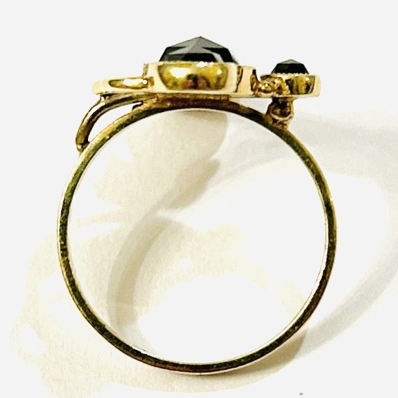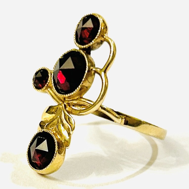 Nepřehlédnutelný, komplikovaný prsten s asymetricky komponovanou hlavicí, stylizované florální křivky odvozeny od secesního tvarosloví, osazeno 4 různě velkými českými granáty (největší o raritním průměru 5,8 mm (!)) kulatého routového brusu fasovaných v zrnitých obrubách. Tuzemská ateliérová práce z konce 20. století. Zhotoveno ze žlutého 14 karátového zlata, tj. o ryzosti 585/1000; punc Z-58 (labuť 4), ryzostní číslo a mistrovská značka "MH" zevnitř šíny. Hmotnost 3,77 g, velikost 55, délka hlavice 25,5 mm. V minulosti upravována velikost, celkově ve velmi zachovalém stavu.