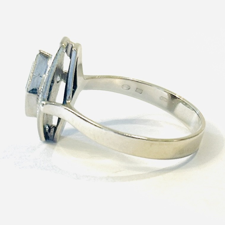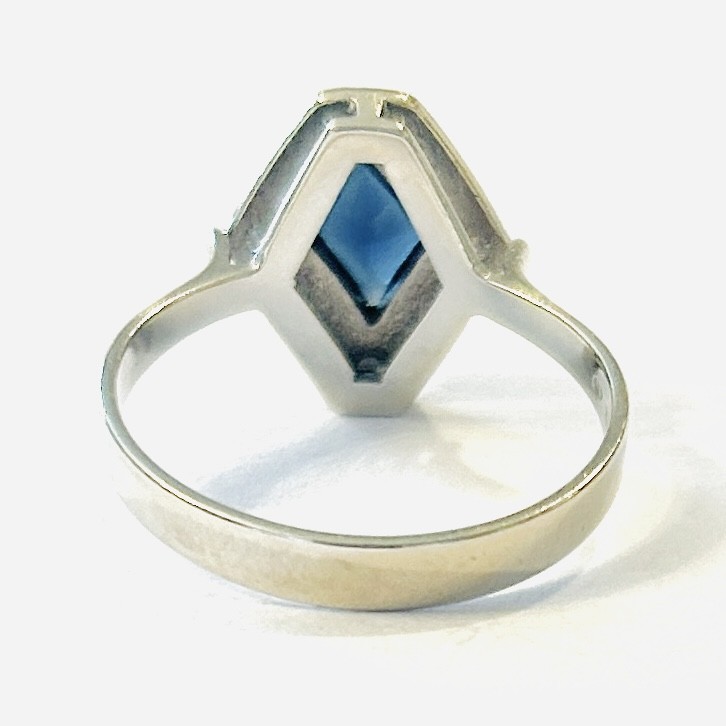 Elegantní prsten stylově čerpající z estetiky období art-deco, uprostřed osazeno syntetickým modrým safírem plochého kosodélného brusu, při vrcholech decentně zdobeno přírodními diamanty kulatého briliantového brusu o celkové váze cca 0,10 ct (0,025 ct - 4 ks), jež jsou velmi dobré kvality. Centrální kámen fasován ve vyvýšené zrnité obrubě, hlavice geometricky členěna rytím a zrnkováním. Tuzemská ateliérová práce z přelomu 20. a 21. století. Zhotoveno z bílého 14 karátového zlata, tj. o ryzosti 585/1000; punc Z-58 (labuť 4), ryzostní číslo a mistrovská značka „OPA“ zevnitř šíny. Hmotnost 3,54 g, velikost 59, délka hlavice 14 mm, šířka 12 mm. V zachovalém stavu, odborně vyčištěno.