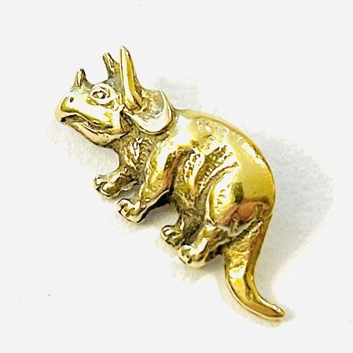 Decentní, hravý přívěšek ve tvaru dinosaura Triceratopse, plastické detailně pojaté tělo. Tuzemská autorská práce z počátku 21. století. Zhotoveno ze žlutého 14 karátového zlata, tj. o ryzosti 585/1000; punc Z-58 (labuť 4), ryzostní číslo a mistrovská značka "MH" zezadu. Hmotnost 1,03 g, délka 19 mm, šířka 8 mm. Ve velmi zachovalém stavu.