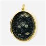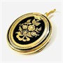 Starožitný oválný přívěšek z období biedermeieru, centrální motiv stylizovaného svazku květin zdobený jemným rytím a osazen přírodními perlami, kontrastní černý smalt s rytým rámováním. Honosnější šperk, západoevropská práce z poloviny 19. století. Zhotoveno z narůžovělého zlata, očko ze 14 karátového, tj. o ryzosti 585, tělo z 13 karátového, tj. o ryzosti 540/1000, vnitřní rámeček z obecného kovu; vyhotoveno osvědčení puncovního úřadu, neznačeno. Hmotnost 4,40 g, váha zlata 1,75 g dle PÚ, celková délka 43 mm, šířka 27 mm. Chybí zadní víčko, smalt poškozen, zohledněno v ceně.