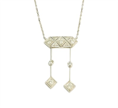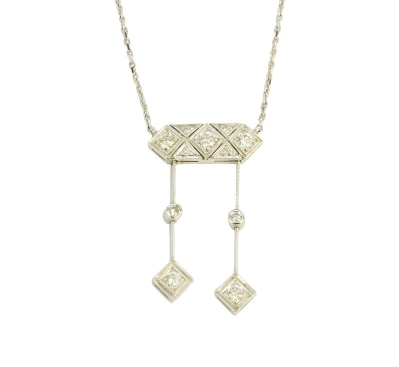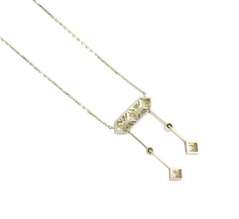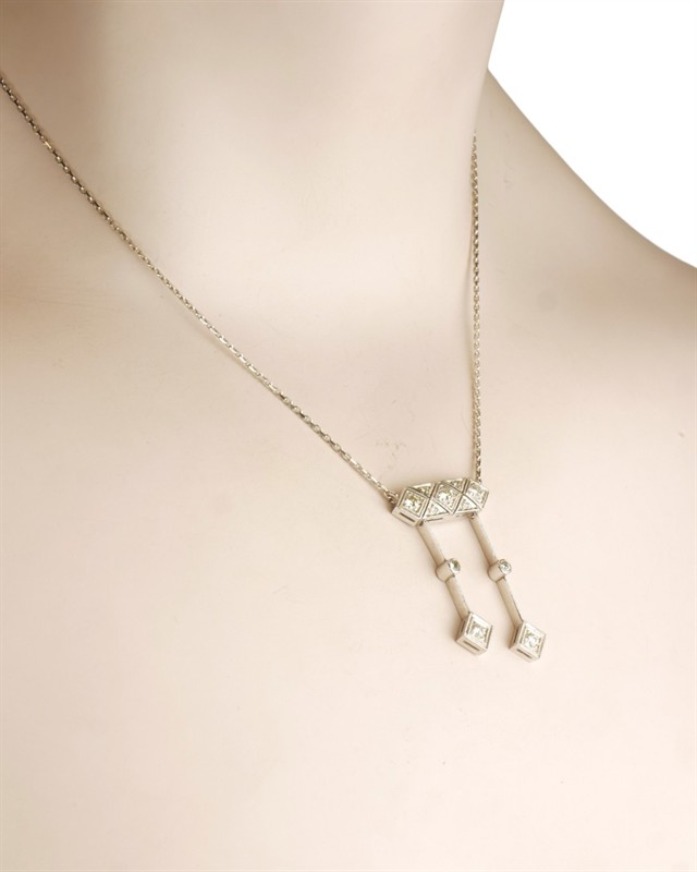 Kolier ve stylu art deco je zhotoven z bílého zlata ryzosti 585/1000 a osazený diamanty briliantového brusu celkové hmotnosti cca 0,40 ct. Celková hmotnost šperku je 4,80 g. Délka řetízku je 46 cm a délka ověsu 3,1 cm.