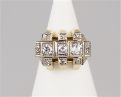 Zlatý brutalistní tvarově nevšední zlatý prsten se 3 diamanty starého briliantového brusu, dobré kvality (0,24 + 0,16 +0,24 ct) a 10 diamanty routového brusu o celkové hmotnosti 0,64 ct. Celková hmotnost Au 10,20g/585/000, punc, odborný posudek. Západní Evropa, 50. léta 20. století, velikost prstenu 54,5.