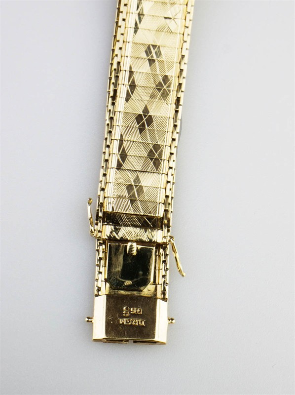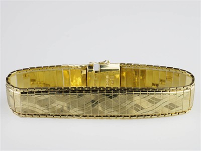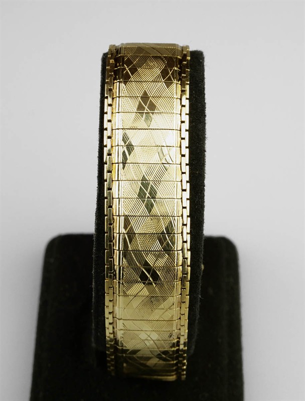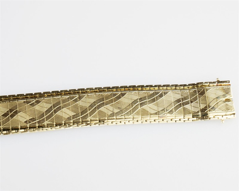 zlatý ”hadí” náramek z drobných obdélníkových článků pospojovaných řetízky, v celé ploše rafinované vlnkovité gilošování s optickým efektem, Au 20,07 g/585/1000, Německo, kolem r. 1935, značka chráněného německého designu, dovozový punc do ČSR (lyra); délka 18 cm