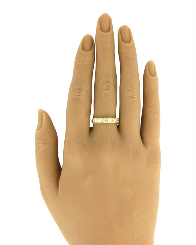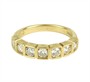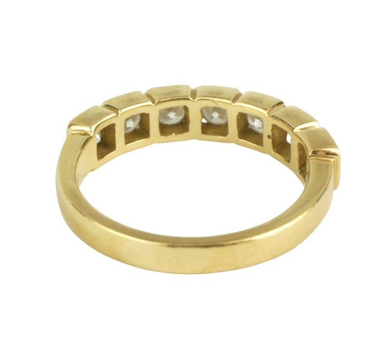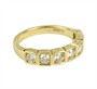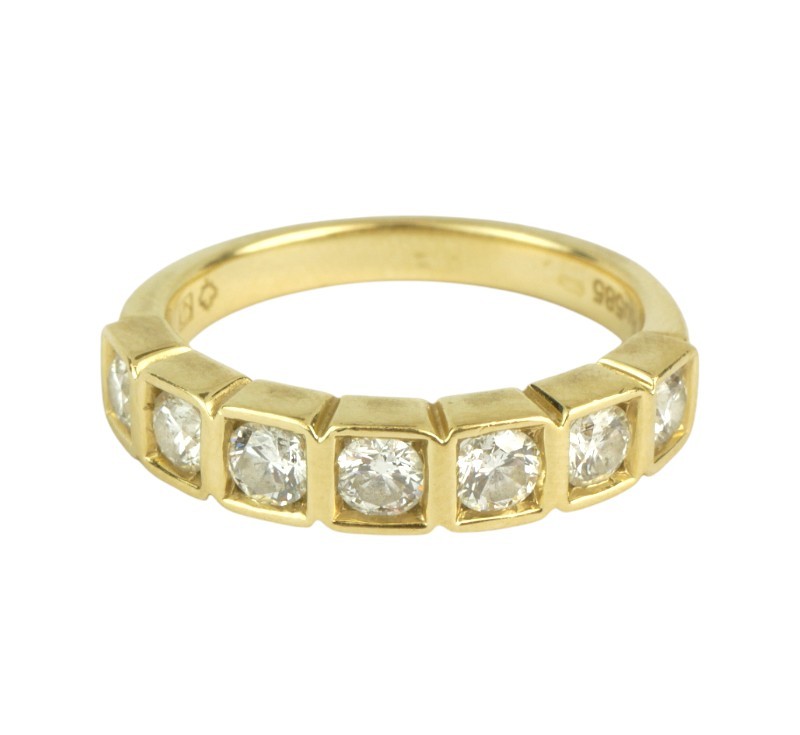 Zářivý, decentní prsten osazený přírodními diamanty kulatého briliantového brusu o celkové váze 0,77 ct (0,11 ct - 7 ks), kvalita velmi dobrá, nezvykle usazeno ve čtvercových lůžkách. Originální geometrizující design, kvalitní západoevropská či severoamerická zlatnická práce z první pětiny 21. století. Zhotoveno ze žlutého 14 karátového zlata, tj. o ryzosti 585/1000; nově opatřeno puncem Z-58 (labuť 4), ryzostní číslo, značka výrobce "RD" a "list" zevnitř šíny. Hmotnost 3,86 g, velikost 54, šířka hlavice 4 mm. V zachovalém stavu, odborně vyčištěno a vyleštěno zlatníkem. Součástí odborný posudek.