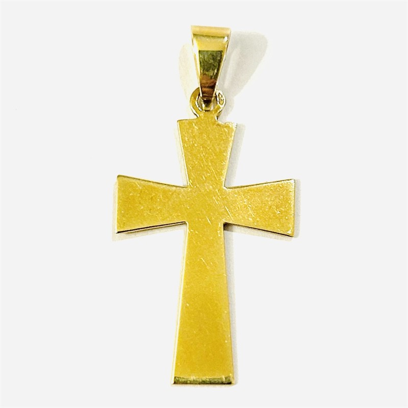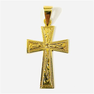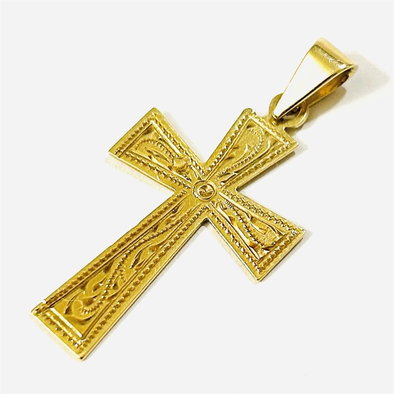 Větší přívěšek ve tvaru latinského kříže s rozšiřujícími se rameny, přední strana zdobena dekorativním gravírováním, zadní ponechána hladká. Kvalitní tuzemská zlatnická práce z 60. až počátku 90. let 20. století. Zhotoveno ze žlutého 14 karátového zlata, tj. o ryzosti 585/1000; punc Z-36 (čejka 4) a značka výrobce na oušku. Hmotnost 2,46 g, celková délka 41 mm, šířka 20 mm. V zachovalém stavu.