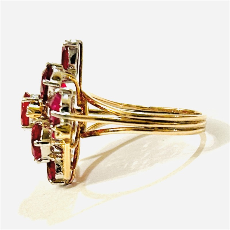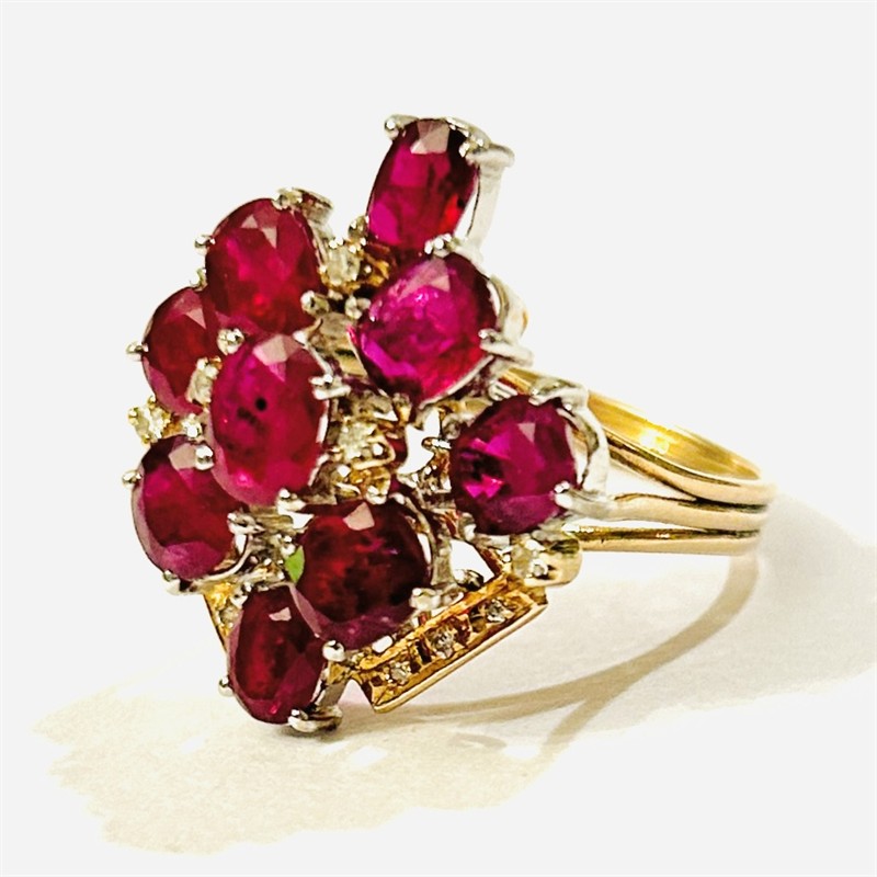 Extravagantní, koktejlový prsten, který je v neotřele komponované stupňovité hlavici osazen přírodními rubíny oválného brusu o celkové váze 4,5 ct (9 ks), jejich kvalita je dobrá (v posudku žádné zmínky o pálení), decentně doplněno o přírodní diamanty kulatého jednoduchého brusu o celkové váze 0,105 ct (11 ks), jejich kvalita je velmi dobrá až dobrá. Barevně kontrastní šína složená z efektních 3 pásků. Orientální ruční zlatnická práce z 2. poloviny 20. století. Šína a část hlavice z narůžovělého žlutého 12 karátového zlata, tj. o ryzosti 500/1000, část hlavice z bílého 8 karátového zlata, tj. o ryzosti 333/1000; vyhotoveno osvědčení puncovního úřadu, nově stornované ryzostní číslo. Hmotnost 6,35 g, velikost 59,5, délka hlavice 23 mm, šířka 21 mm. V zachovalém stavu, odborně vyčištěno a vyleštěno zlatníkem. Součástí odborný posudek.