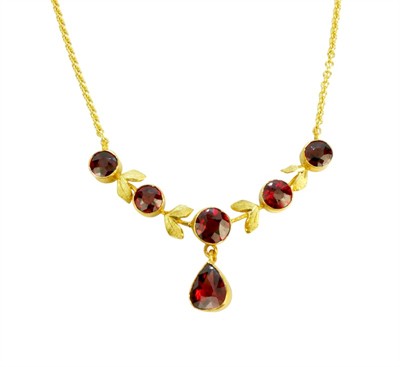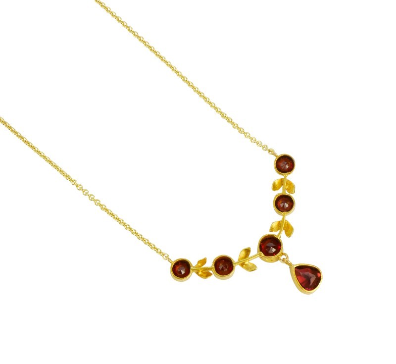 Jemný secesní náhrdelník ze žlutého zlata ryzosti 585/1000 je zdobený drobnými zlatými lístky a almandiny. Celková hmotnost náhrdelníku je 4,88 g. Délka cca 57 cm.