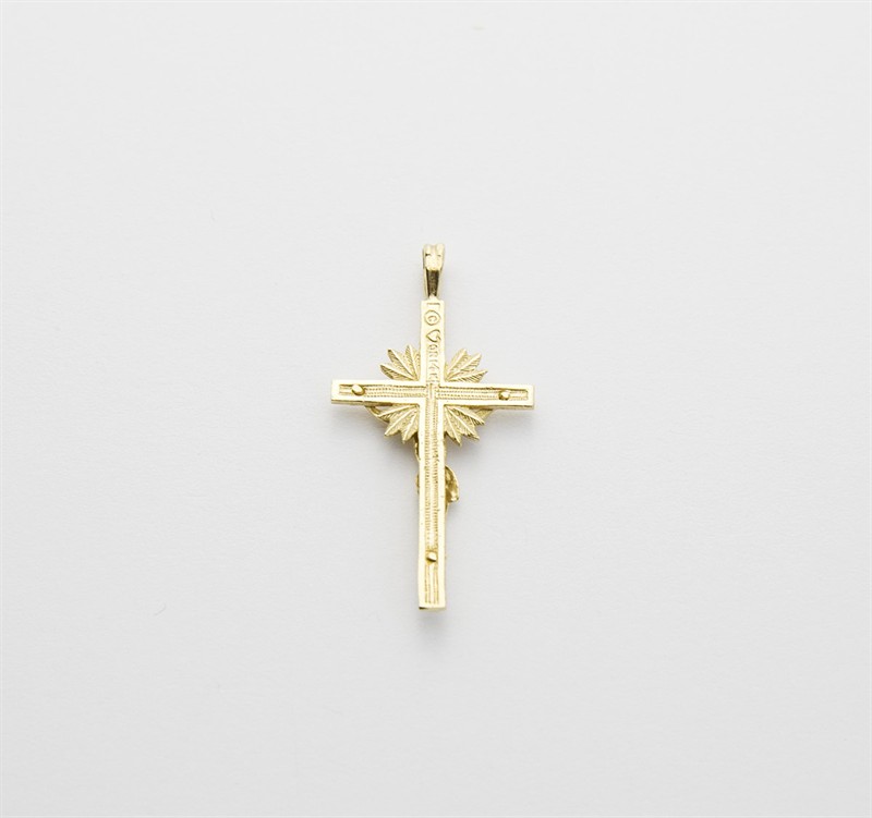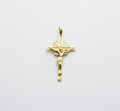 zlatý kříž s velmi povedeným detailním zobrazením Ježíše Krista, paprsky vyzařující zpoza kříže symbolizují vítězství nad smrtí, Au 1,91 g/585/1000, Západní Evropa, kolem r. 1995, puncováno, rozměry 3,8 x 2 cm