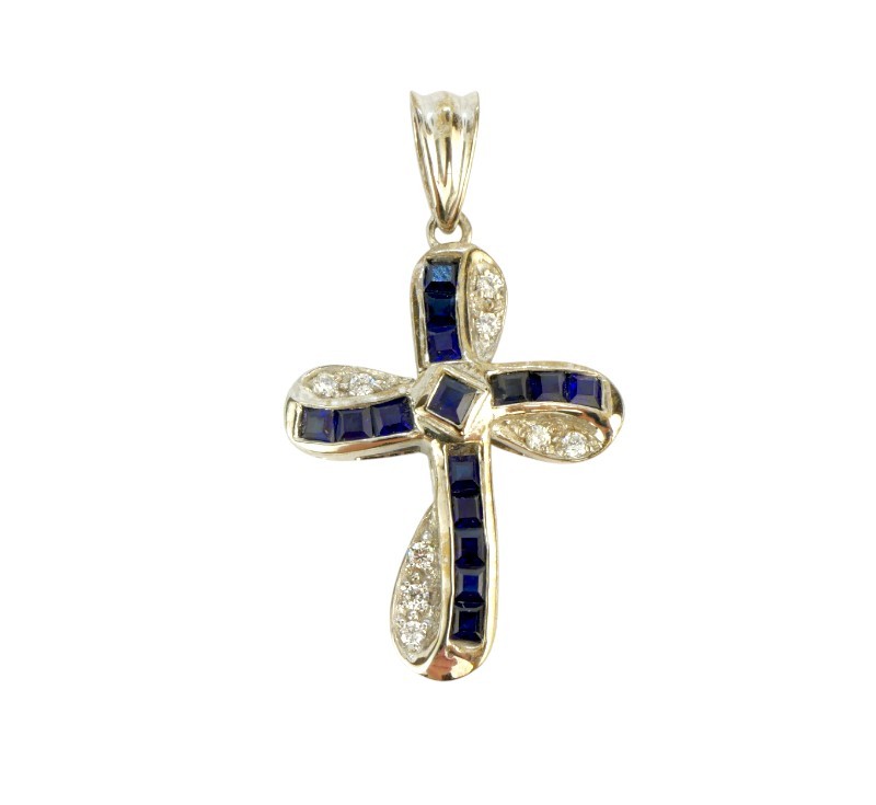 Závěs vyrobený ze zlata ryzosti 585/1000 zdobený brilianty a safíry. Rozměry křížku jsou 2,4 x 1,9 cm. Celková hmotnost 3,24 g.