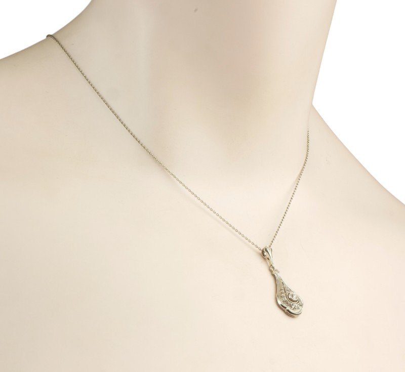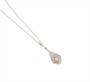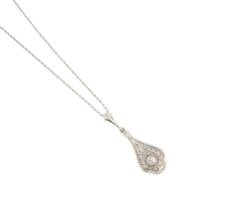 Náhrdelník art deco s drobným diamantem starého briliantového brusu hmotnosti cca 0,10 ct. Přívěšek je ze zlata ryzosti 585/1000, řetízek ze stříbra ryzosti 600/1000. Uzávěr z platiny ryzosti 750/1000. Délka řetízku 44 cm. Rozměry přívěšku 2,8 x 1,1 cm. Celková hmotnost šperku 2,4 g. K dispozici Osvědčení Puncovního úřadu.