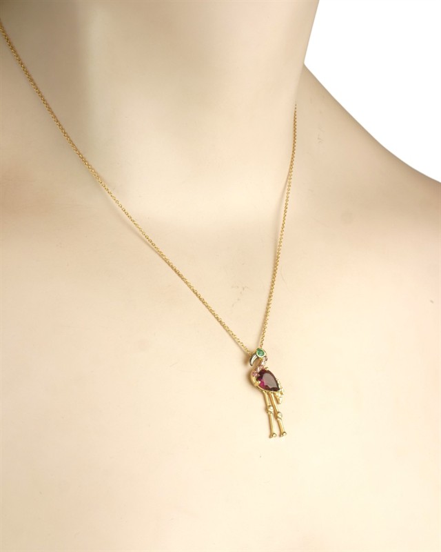 Náhrdelník ze žlutého zlata ryzosti 585/1000 ve tvaru plameňáka se smaragdem, turmalínem a diamanty briliantového brusu o celkové hmotnosti 0,05 ct. Celková hmotnost šperku je 2,88 g. Délka řetízku je 44 cm.