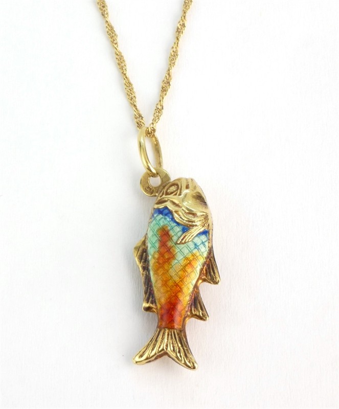 Náhrdelník vyrobený ze zlata ryzosti 585/1000 zdobený přívěskem se smaltovanou rybkou. Rozměry přívěsku 2,2 x 1,0 cm. Celková hmotnost 3,26 g. Délka řetízku 44 cm. Punc lyra.