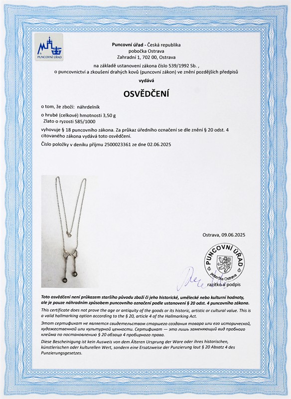 zlato o ryzosti 585/1000 váha 3,5 g výška přívěsku 4 cm délka řetízku 41 cm diamanty cca 0,17 ct výborný stav osvědčení puncovního úřadu
