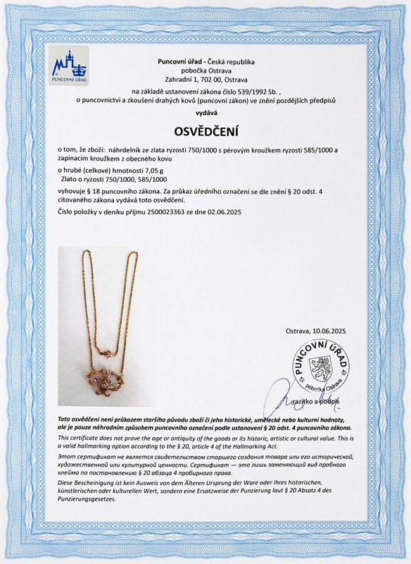 zlato o ryzosti 750/1000, 585/1000 váha 7,05 g výška přívěsku 2,7 cm, šířka 2,9 cm délka řetízku 45 cm náhrdelník 750/1000 pérový kroužek 585/1000 zapínací kroužek s obecného kovu výborný stav osvědčení puncovního úřadu