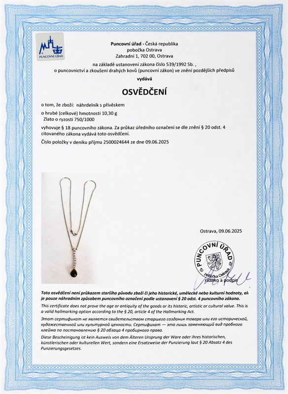 zlato o ryzosti 750/1000 váha 10,30 g výška přívěsku 4 cm délka řetízku 43 cm přírodní safírový kabošon 1 ks 5,50 ct, rozměr 11x9 mm přírodní diamant 1 ks 0,10 ct přírodní diamanty 7 ks 0,42 ct vzácně bílý (F-G-H), čistota SI1-SI2 výborný stav osvědčení puncovního úřadu certifikát z gemologické laboratoře je součástí šperku