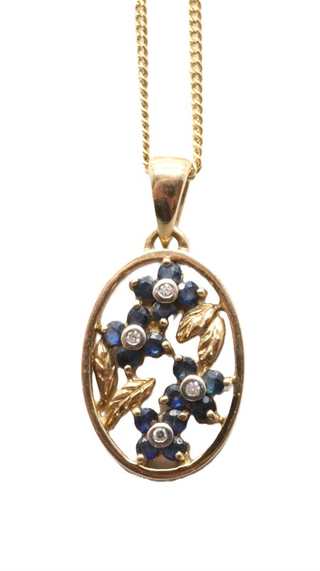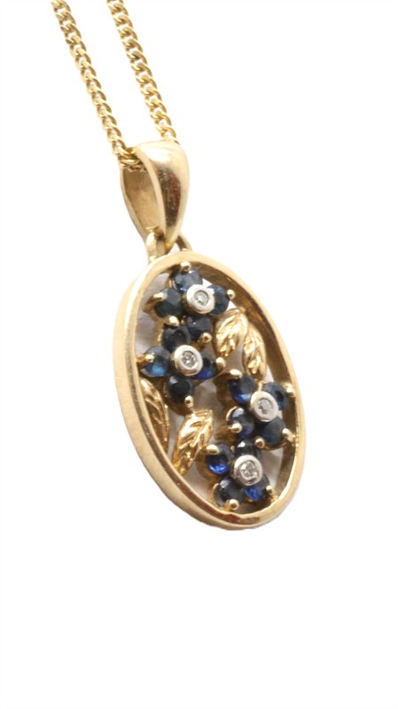 Zlatý náhrdelník s diamanty a safíry. Žluté zlato 375/1000. Přírodní safíry, celková váha 0,48 ct. Přírodní diamanty, kvalita SI1 - SI2, barva H - I, celková váha 0,02 ct. Váha náhrdelníku: 4,18 g. Rozměr přívěsku: 1,8 cm x 1,3 cm. Délka řetízku: 46 cm.